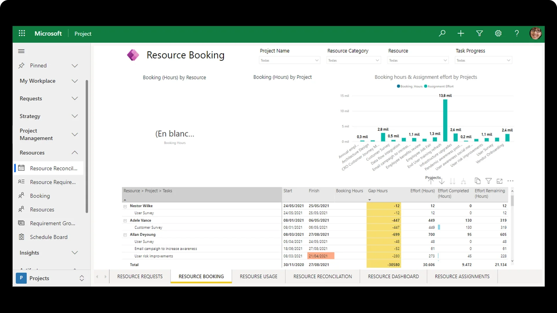View reporting in Power BI that compares the Resource Plans (reservations) against the Resource Assignments made in Project Plans in Project for the web. -